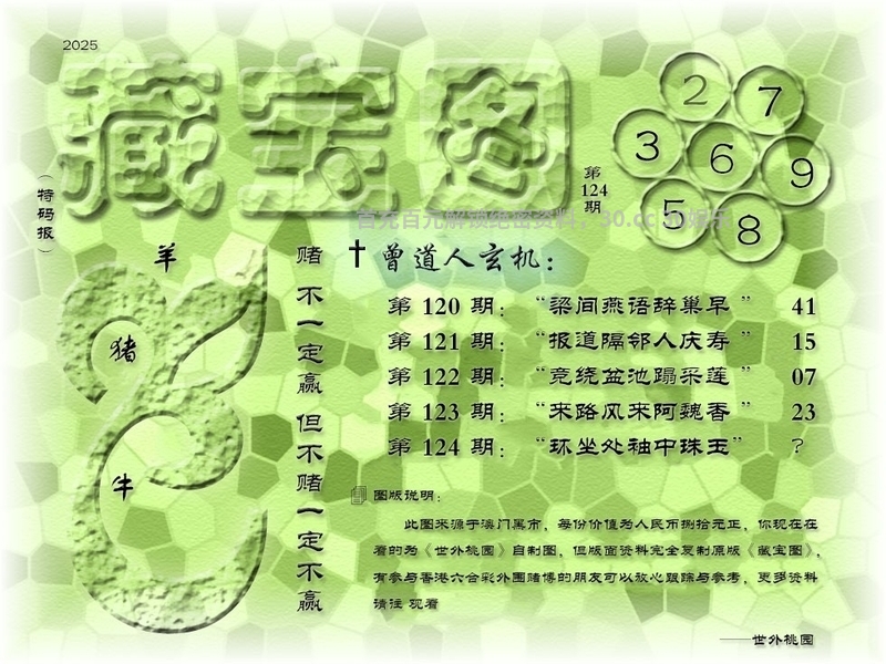 126期藏寶圖新:造化无心本不知 老:流到前溪无半语 禁:兔 禁:8尾 玄機字:《离》